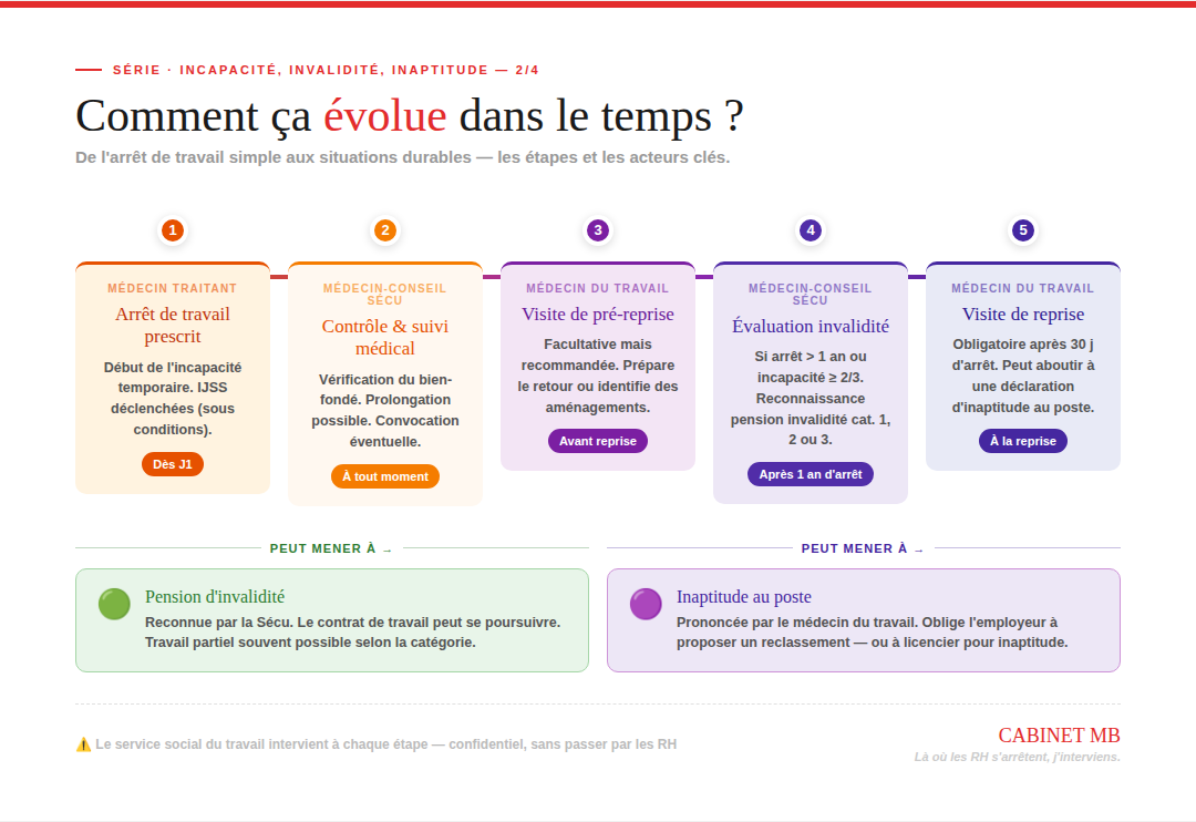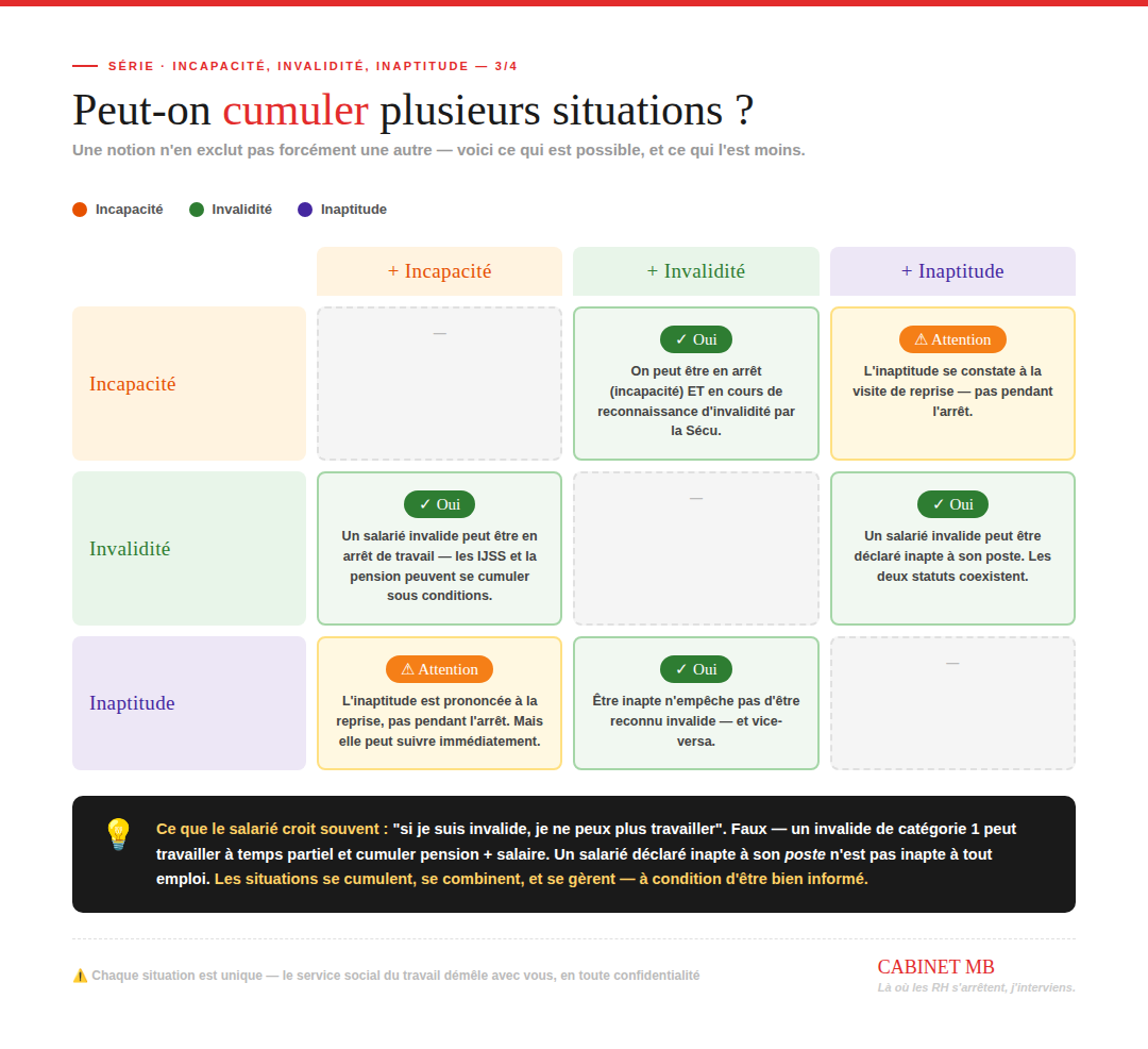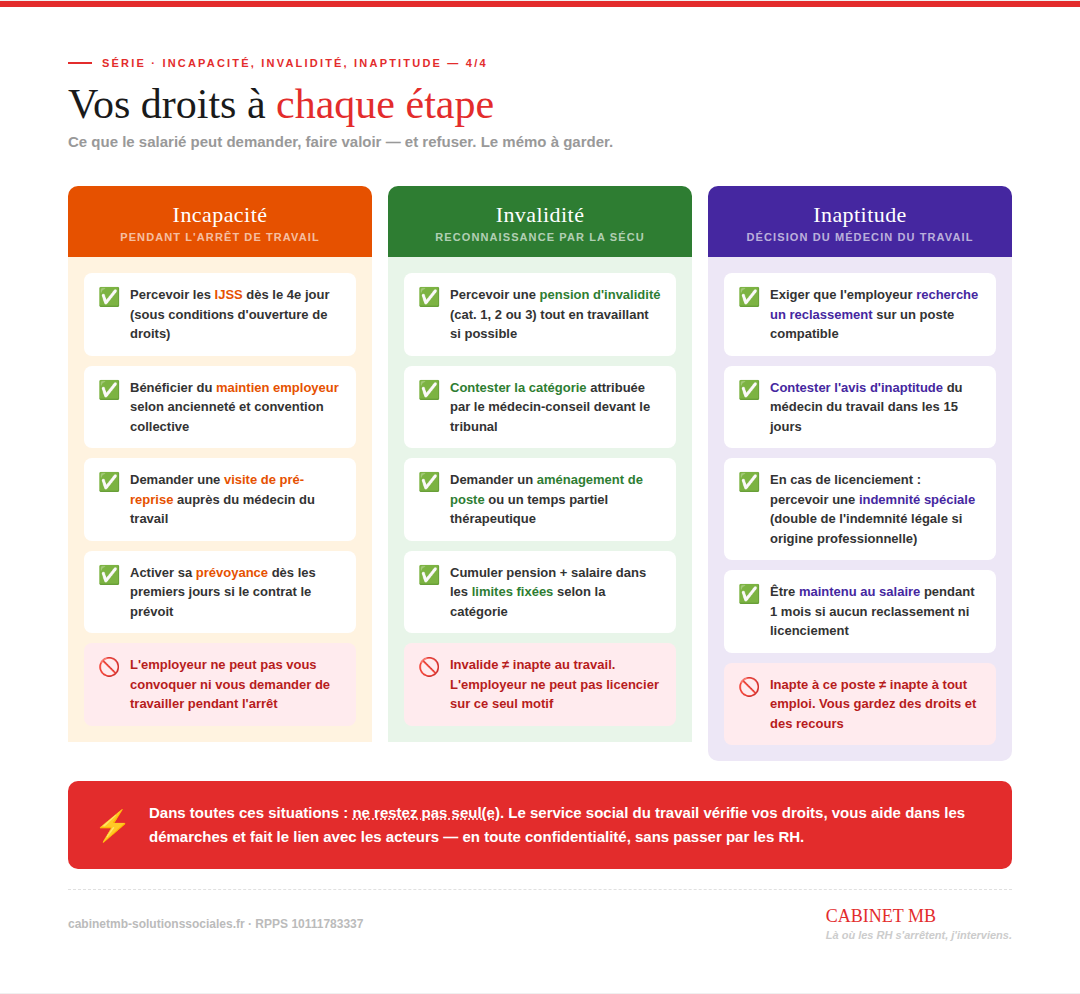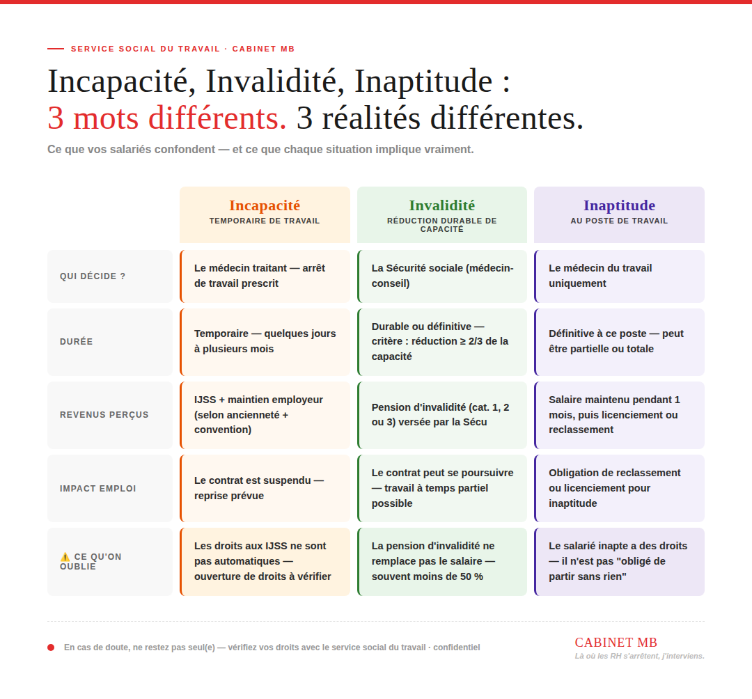 Incapacité, Invalidité, Inaptitude : 3 mots que vos salariés confondent — et qui peuvent tout changer. Coordination SST/RHDémarches administratives & droit au travailMaintien en emploi 3 mars Écrit par Marlène BOURGEOIS IncapacitéInvaliditéInaptitudeDroits des salariésService social du travailArrêt de travail Marlène BOURGEOIS Service social du travail externalisé et coaching professionnel https://www.cabinetmb-solutionssociales.fr
